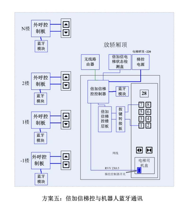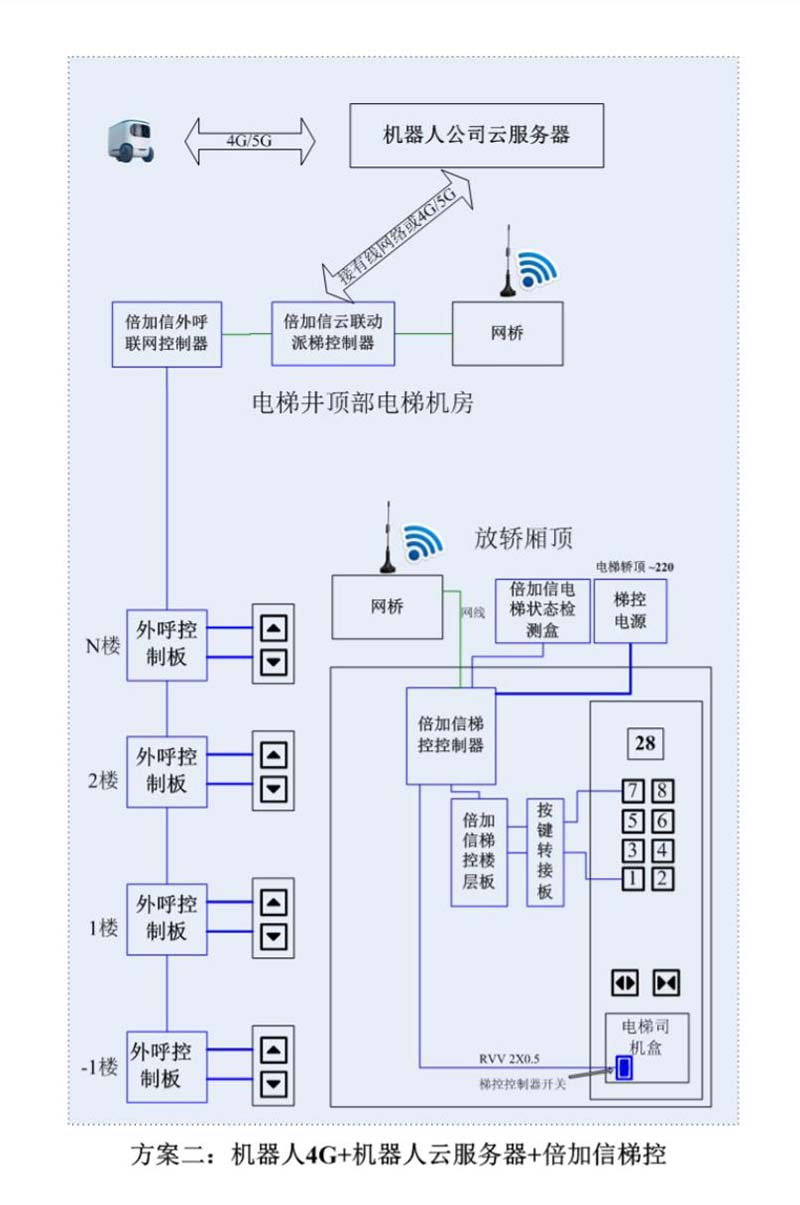 (1)機器人在電梯外,通個Wifi、藍牙、LoRa、Zigbee、2.4G、433M、語音或4G網(wǎng)絡等發(fā)送指令倍加信梯控系統(tǒng),系統(tǒng)自動點亮上樓或下樓按鍵,實現(xiàn)呼梯功能。