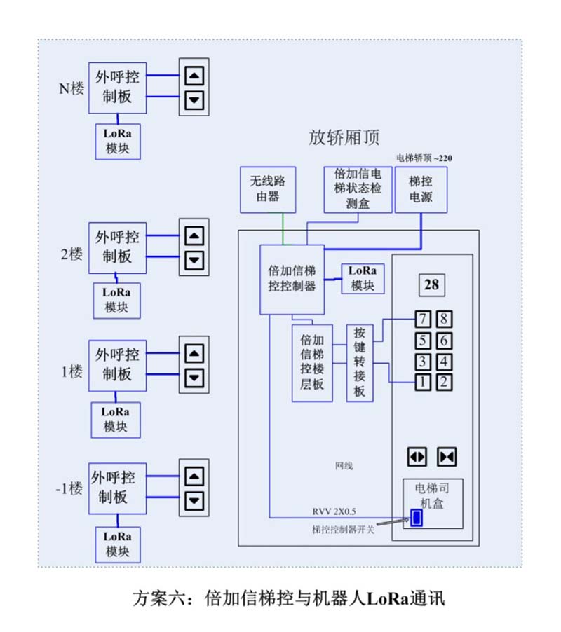 (1)機器人進入電梯后,通個Wifi、藍牙、LoRa、Zigbee、2.4G、433M、語音或4G網(wǎng)絡等發(fā)送給倍加信梯控系統(tǒng),系統(tǒng)自動點亮對應樓層按鍵,比如發(fā)去6樓指令,則6樓按鍵自動點亮,電梯送機器人員到6樓。