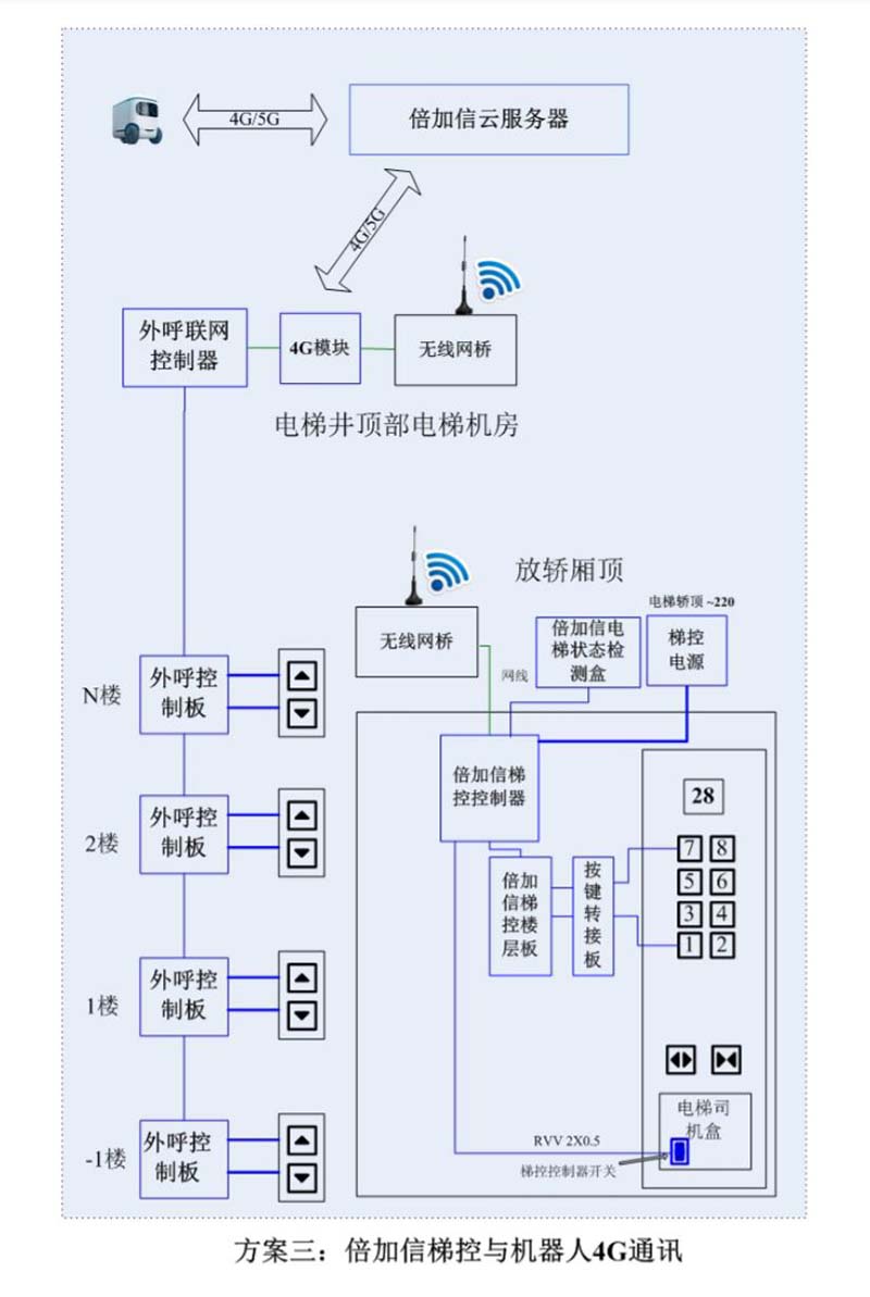 (1)機(jī)器人在電梯外,通個(gè)Wifi或4G網(wǎng)絡(luò)發(fā)送指令給倍加信梯控平臺(tái),倍加信梯控云平臺(tái)收到指令后,將指令發(fā)給倍加信梯控系統(tǒng),倍加信梯控系統(tǒng)自動(dòng)點(diǎn)亮上樓或下樓按鍵,實(shí)現(xiàn)呼梯功能。