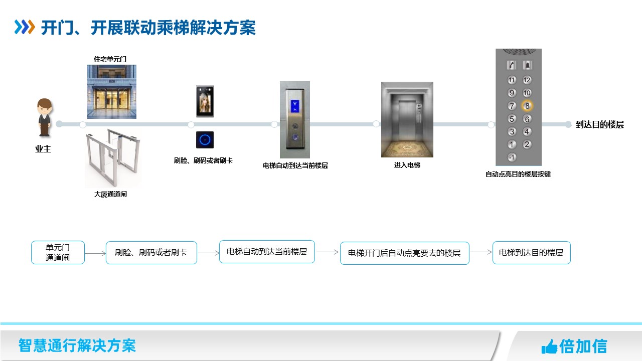 在住宅小區(qū)項目、寫字樓有通道閘項目,業(yè)主只需要在單元門或者通道閘上刷卡、刷臉、或者刷二維碼后,開門或者開閘后,同時系統(tǒng)自動呼叫電梯到當前樓層,電梯到達后,自動開門,乘梯人進入電梯不需要再刷卡/刷臉/刷碼,電梯自動點亮業(yè)主所住樓層按鍵。