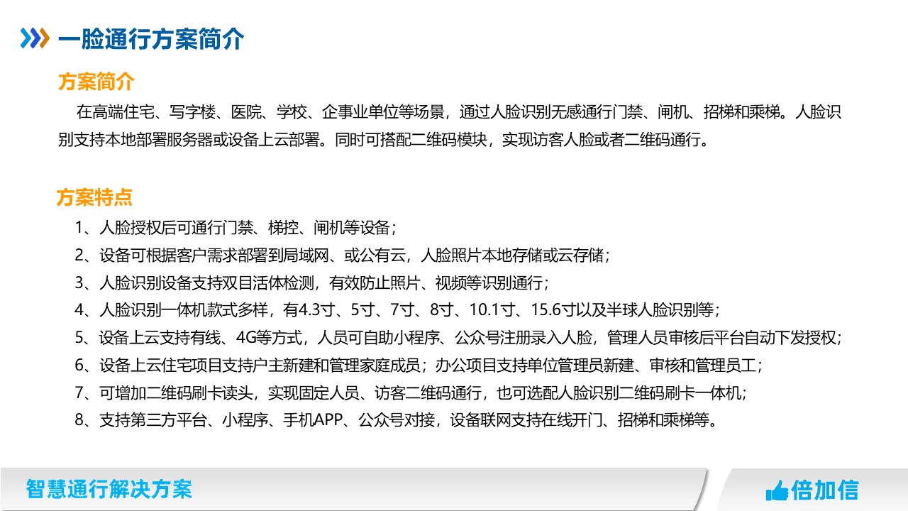 在高端住宅、寫字樓、醫(yī)院、學校、企事業(yè)單位等場景,通過人臉識別無感通行門禁、閘機、招梯和乘梯。人臉識別支持本地部署服務器或設(shè)備上云部署。同時可搭配二維碼模塊,實現(xiàn)訪客人臉或者二維碼通行。