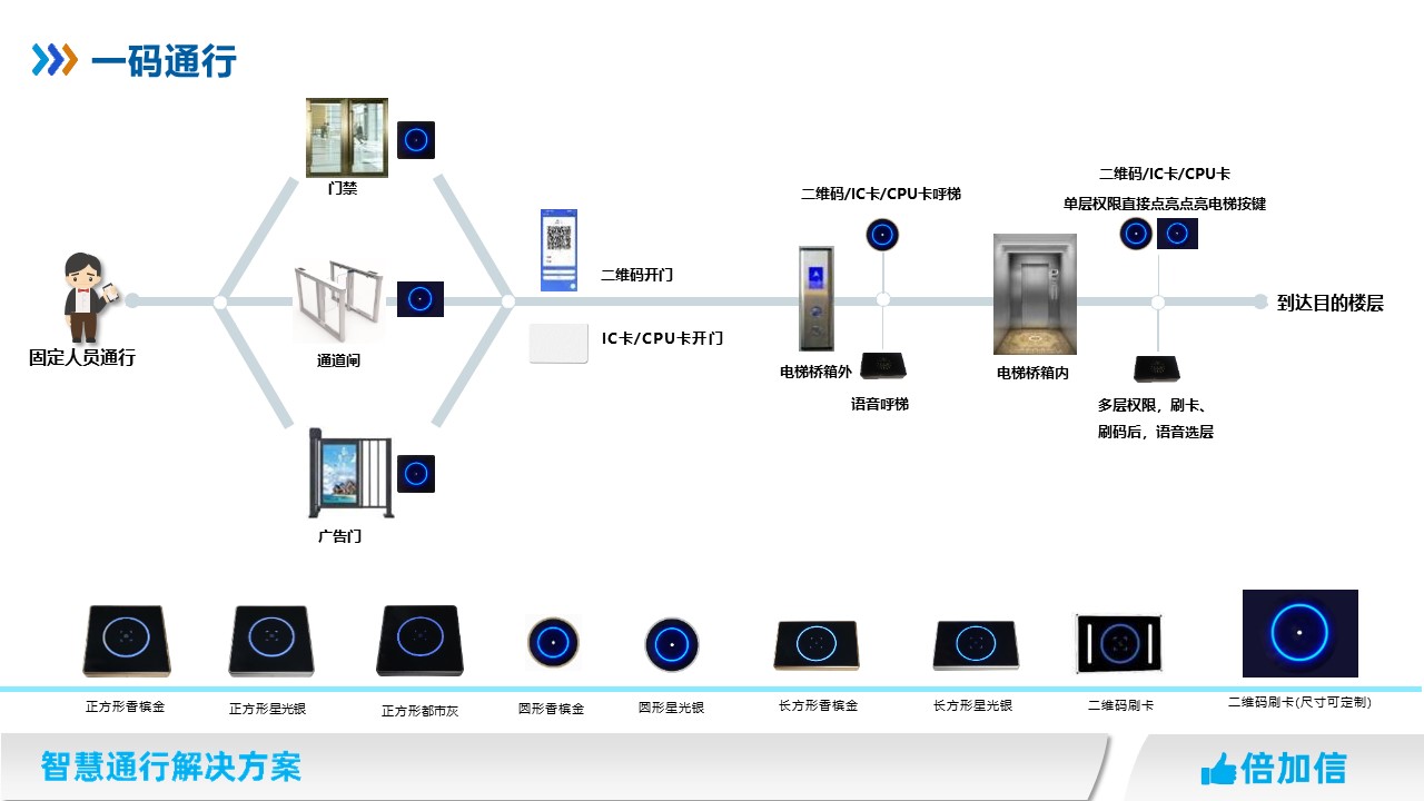 固定人員在門禁系統(tǒng)、梯控系統(tǒng)、通道閘系統(tǒng)、停車場系統(tǒng)、廣告門等系統(tǒng),實現(xiàn)一碼通行、一卡通行、一臉通行。