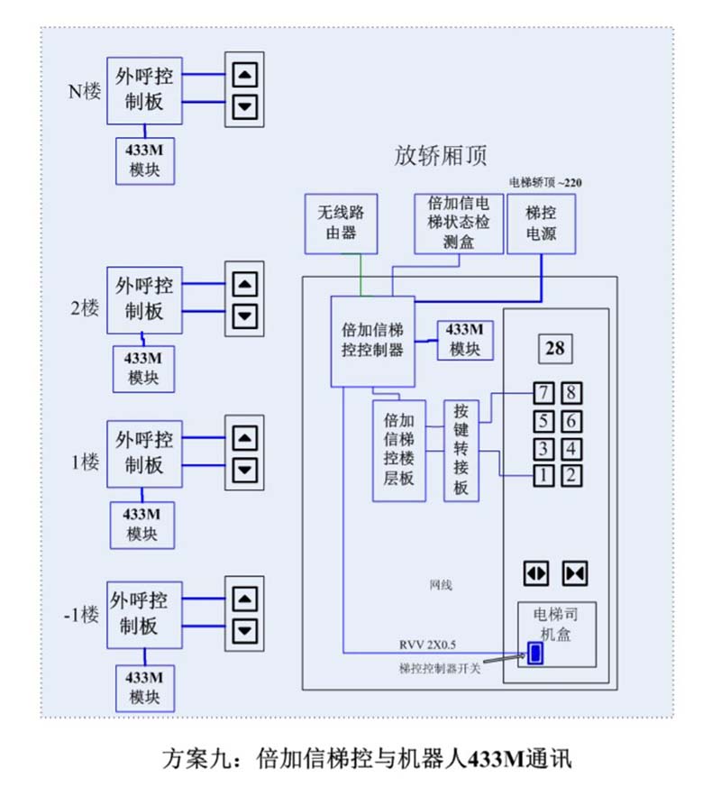 (1)機器人在電梯外,通過433MHz通訊發送指令倍加信梯控系統,系統自動點亮上樓或下樓按鍵,實現呼梯功能。