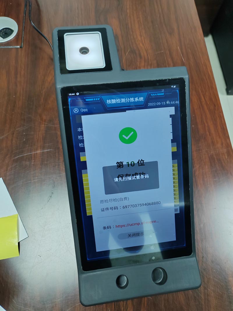 2.、做核酸人員掃核酸碼,系統提示采集成功,同時工作人員拿棉簽
