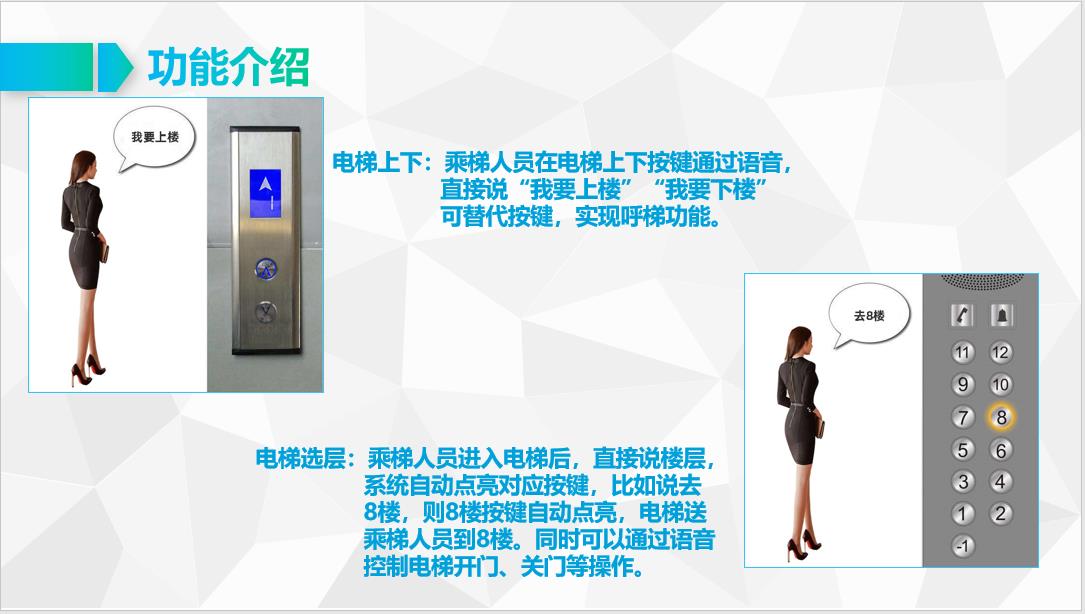 倍加信語音梯控喚醒詞是“智能電梯”或者“小梯小梯”,之所以加換新詞,是為了防止乘梯人誤識別,導致點亮樓層按鍵,多人乘梯,第一個人說換新詞即可,比如說“智能電梯,去8樓”,后面人可以不需要說換新詞,直接說“去9樓”“去12樓”等。如果語音梯控喚醒后,10秒內無人再繼續說,則語音梯控進入休眠狀態,需要再次語音乘梯則需要喚醒。