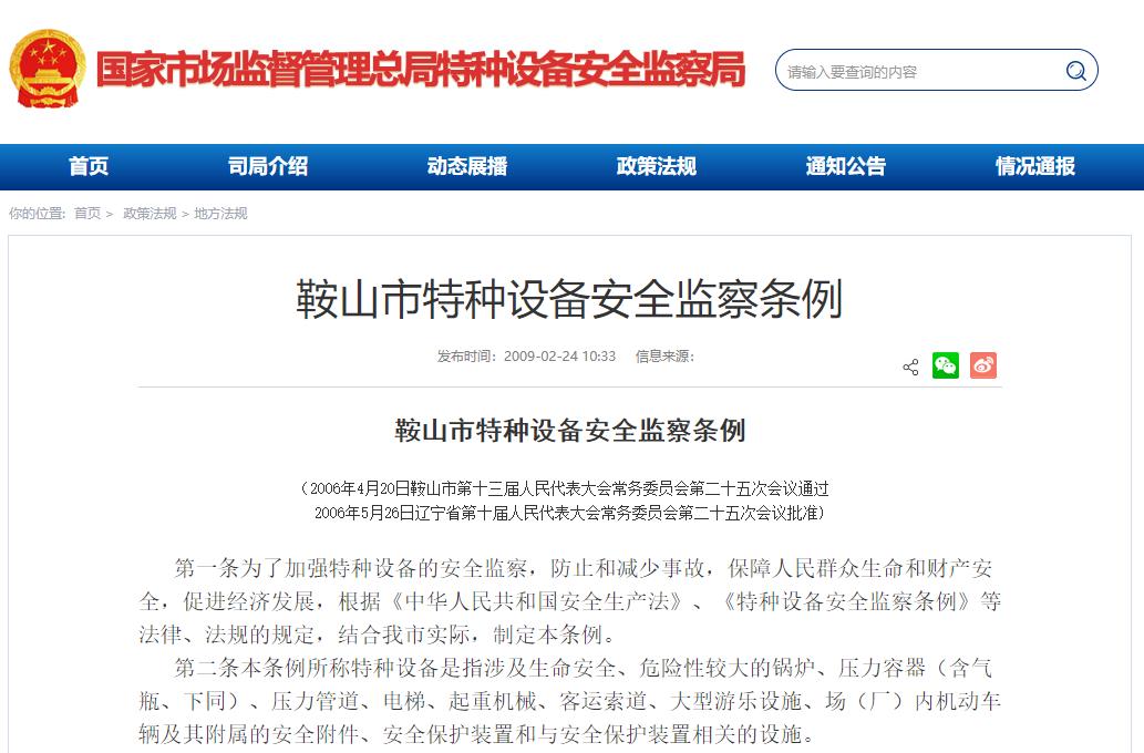 《鞍山市特種設備安全監察條例》2006年5月26日遼寧省第十屆人民代表大會常務委員會第二十五次會議批準
