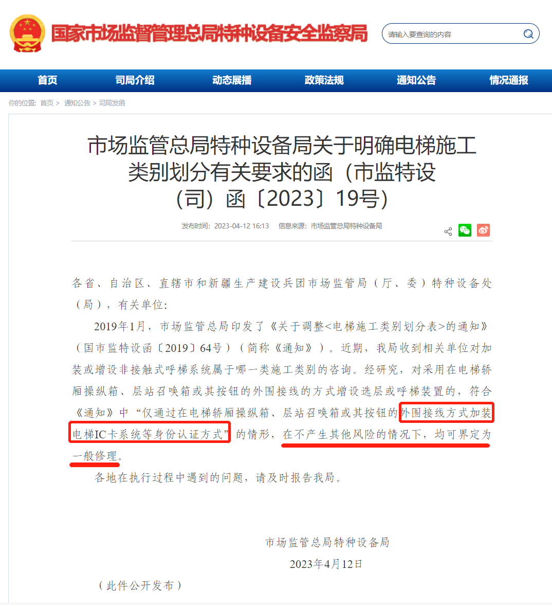 2023年4月12日市場監(jiān)管總局特種設備局再次發(fā)函,按鍵方式加裝梯控屬于一般修理。